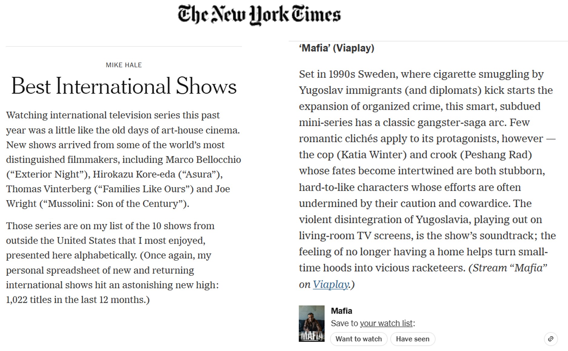 New York Times - Mafia 'Best International Shows of 2025' Selection